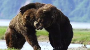 Nagy és heves párbaj két medve között az Alaszkai-félszigeten. A videót a Lake Clark Nemzeti Park határán rögzítették. Két óriási hím verseng a költési időszak dominanciájáért egy réten.