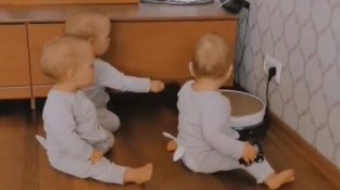 Egy anyuka egy robotporszívóval nézi, ahogy hármasikrei játszanak. Ezután távolról elindítja a vákuumot, mindhárom baba mászni kezd.