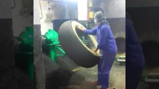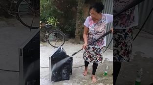 Egy nő Portugáliában nagynyomású mosógéppel és szappannal tisztítja piszkos tévéjét.