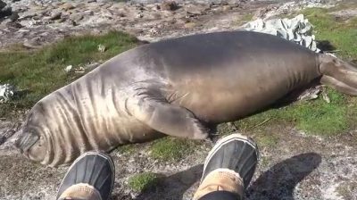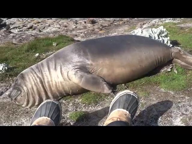 Di Kepulauan Falkland, seekor gajah laut muda dengan rasa ingin tahu mendekati seorang turis. Setelah pemeriksaannya, dia terjatuh dari lereng.
