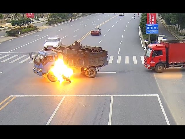 Pada hari Sabtu, 6 Mei di Nanchang, Tiongkok, seorang pria sedang mengendarai sepeda motor ketika bertabrakan dengan truk, jatuh ke tangki bahan bakarnya. Tabrakan itu langsung menyulut minyak, membakar tubuh pengendara sepeda motor tersebut.