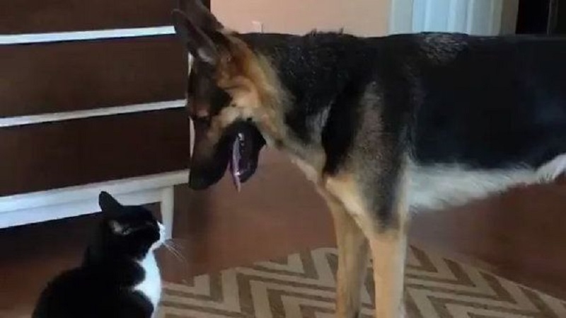 Di sebuah rumah, seekor kucing dan seorang gembala jerman sedang berkelahi. Anjing ingin bermain dan kucing mencoba mengusirnya dengan cakarnya. Tapi setelah beberapa detik, kucing akan mendekati anjing agar tidak memukulnya, tapi untuk memahatnya di kepala.