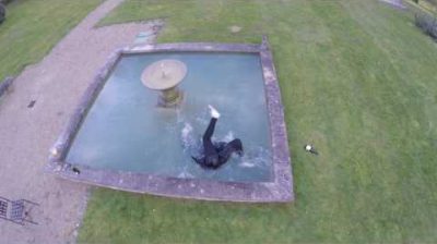 Selama menginap di Kastil St Julien dekat Poitiers saat Paskah (akhir Maret 2017), seorang wanita ingin meringis dengan menarik lidahnya ke drone yang merekamnya. Namun terdekonsentrasi oleh benda terbang tersebut, dia mundur, melupakan baskom air mancur di belakangnya. Orang-orang miskin itu terjatuh ke dalam air dingin dari baskom. Seorang pemuda segera terbang menyelamatkannya.