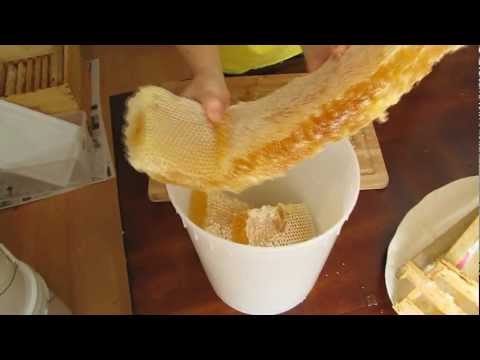 Membuat potongan sisir dan pembotolan madu dari lima bingkai madu tanpa dasar terakhir kami di tahun 2011. Metode ini disalin dari Peternak Lebah Mundur yang ditampilkan di sini: