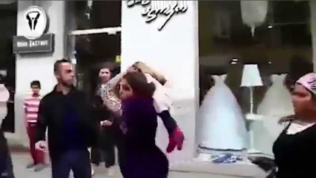 Seorang wanita menggunakan anaknya sebagai klub, untuk memukul seorang pria setelah berkelahi.