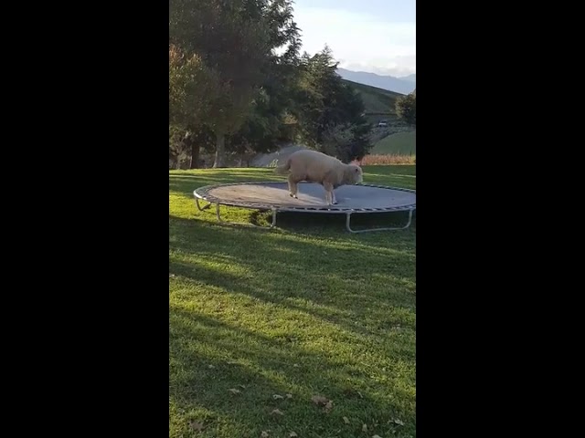 Seekor domba melompat di atas trampolin di Selandia Baru.