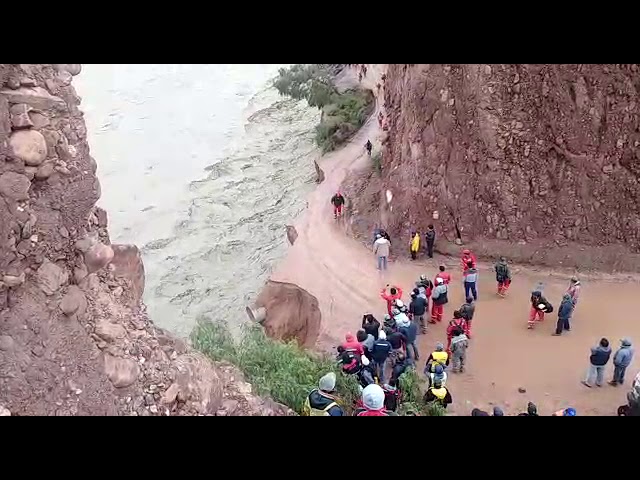 Cuaca buruk di Tupiza, Bolivia, menyebabkan banyak tanah longsor di jalan pegunungan akibat banjir. Empat pria mencoba menyeberang jalan sebelum terlambat, dan pada akhirnya sebagian besarnya akan runtuh. Orang terakhir sangat beruntung.