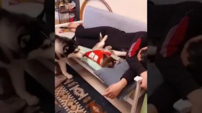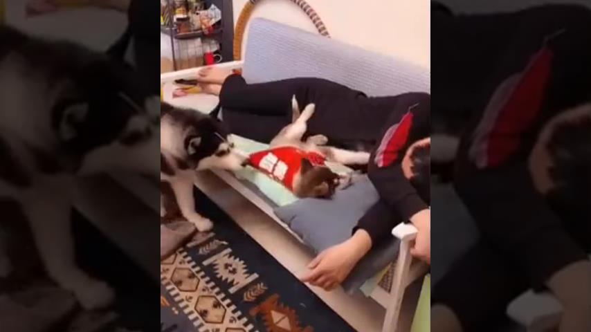 Seekor anjing husky ingin tidur di sofa sebelah tuannya, tapi di tempat itu ada seekor anak anjing. Namun anjing tersebut tidak segan-segan menarik anak anjing tersebut dari sofa dan melemparkannya ke bawah untuk menggantikan tempatnya.