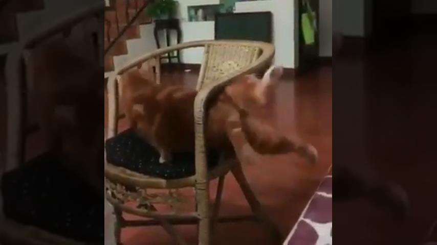 Seekor kucing mengalami kesulitan saat mencoba melewati lengan kursi.