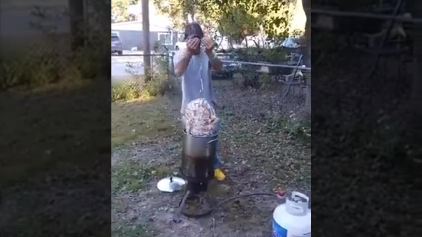 Seorang pria mencoba memasukkan kalkun yang mungkin masih beku atau basah, dalam panci berisi minyak panas.