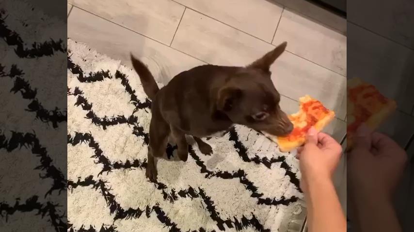 Seekor anjing kecil ingin makan pizza, tapi potongan itu menempel di gigi rahang atasnya. Dia kemudian berdiri dengan mulut terbuka, tanpa bisa menelan potongan itu.