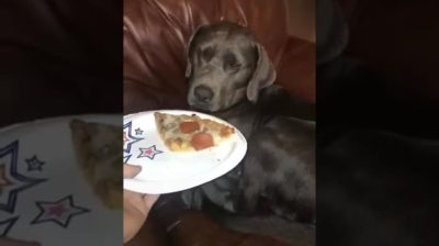 Seorang pria ingin menggoda anjingnya, membawakan sepotong pizza untuknya. Namun anjing itu tampaknya telah mempelajari triknya, dan akan mengambil potongan itu dengan kecepatan luar biasa.