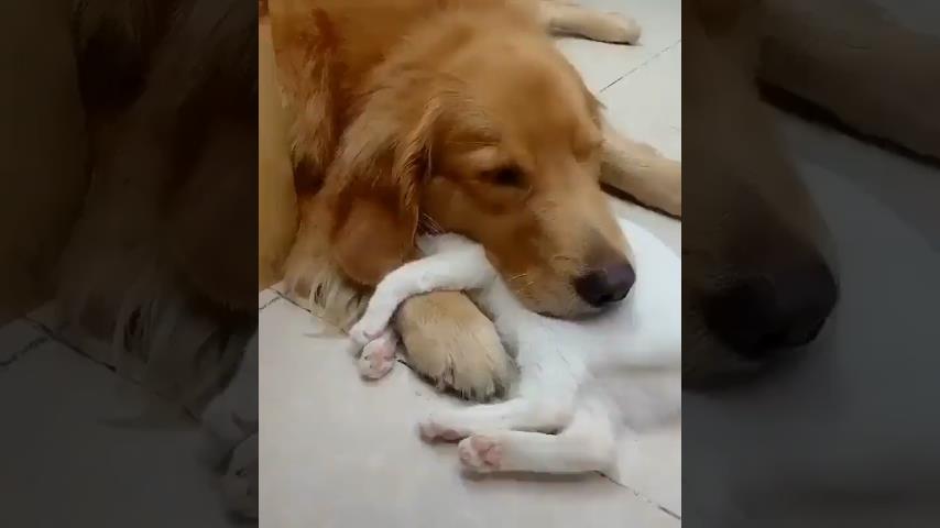 Seekor kucing dan anjing sedang tidur bersama dan bermain bersama.