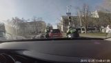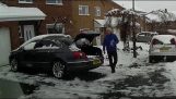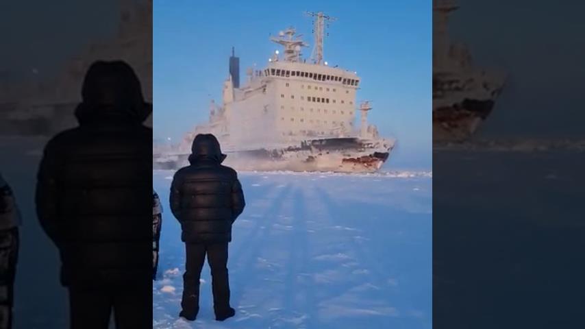 Tiga orang Rusia sedang memperbaiki mobil salju di lautan Arktik, ketika kapal pemecah es nuklir melewati mereka. Kapal besar lainnya mengikuti di belakangnya.