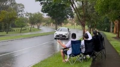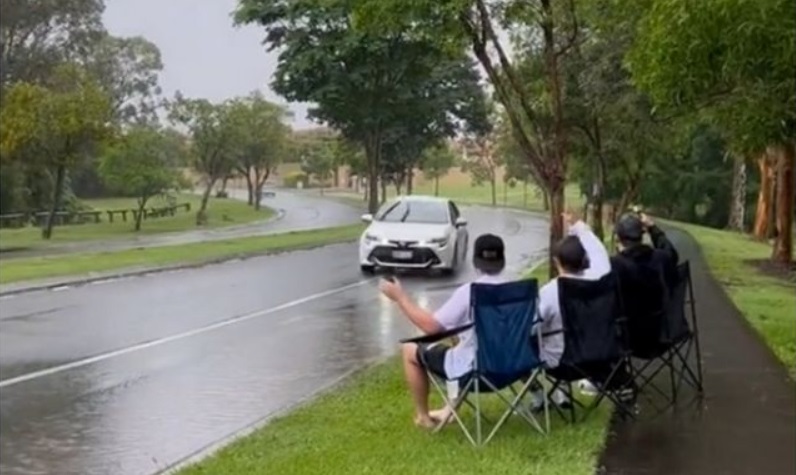 Saat mereka minum bir di tengah hujan dan duduk di pinggir jalan yang basah, Tiga pria yang membawa plang mengajak pengendara basah-basahan dengan melewati genangan air yang besar.