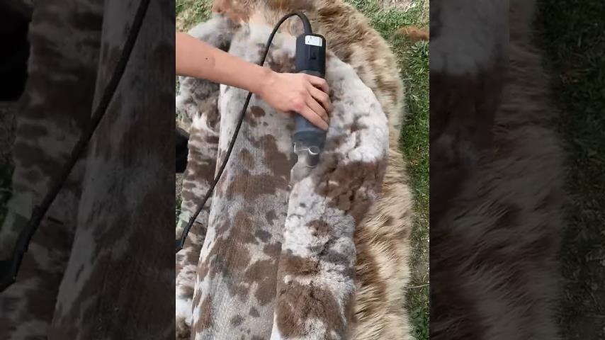 Seekor llama sedang bersantai sambil berbaring di rumput, seperti seorang tukang cukur memotong rambutnya yang tebal.