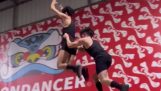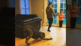 Seorang pria menirukan suara mengeong kucing yang ganas, menangkap reaksi kucing di belakangnya.