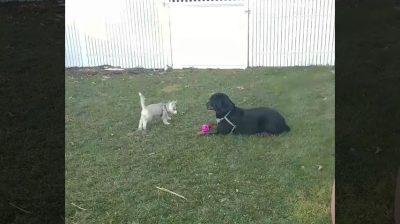 Seekor anak anjing menggonggong meminta mainan anjing yang besar. Yang terakhir akan menakuti anak anjing dengan gonggongan yang keras.