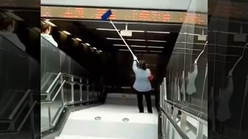 Seorang petugas kebersihan di stasiun kereta mengira dia sedang membersihkan tanda yang menyala dengan teks bergulir, memegang sapu dengan mantap di atasnya.