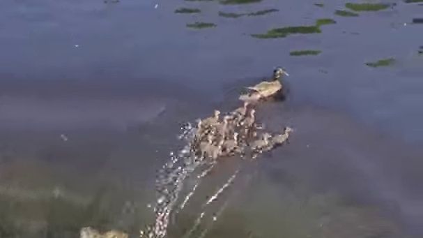 Di sebuah danau, seekor bebek melakukan kesalahan dengan membawa 9 anak itiknya terlalu dekat ke air terjun. Saat bebek menyadari kesalahannya, dia segera berbalik dan berenang sekuat tenaga. Bebek melakukan hal yang sama, tapi mereka harus berjuang melawan arus yang kuat. Untungnya, semua orang lolos dari bahaya.