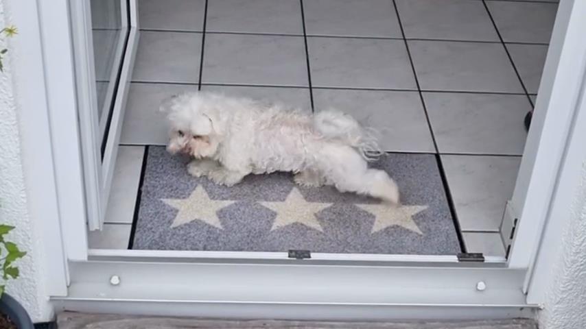 Seekor anjing membersihkan cakarnya di atas karpet, sebelum memasuki rumah.
