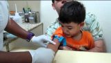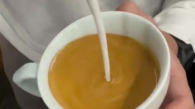 Barista menyiapkan cappuccino ulang tahun dengan gambar yang tidak konvensional untuk gadis yang berulang tahun. Dia “menggambar” kue dengan lilin dari busa susu.
