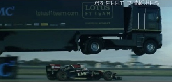 Sebuah truk Renault berukuran besar melompati mobil Formula 1 menggunakan tanjakan. Sebuah aksi/iklan luar biasa yang dibuat untuk mempromosikan kemitraan antara tim F1 Lotus Inggris dan EMC, perusahaan yang berspesialisasi dalam aplikasi cloud.