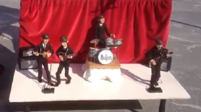 Boneka kecil bergambar The Beatles membawakan lagu 'Help' di sebuah jalan di San Sebastian, Spanyol. Dua wanita dengan ahli mengendalikan boneka-bonekanya.