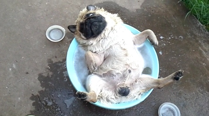 Pada hari yang cerah di Thailand, seekor anjing bersantai di baskom berisi air dan mandi. Dengan kaki di udara, anjing pug itu sedang berbaring sambil mendengkur.