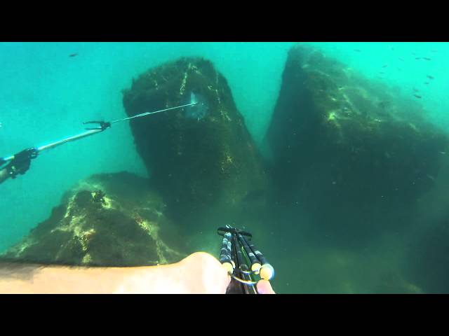 Seorang pria mencoba menangkap ikan kecil (Chaetodipterus faber) dengan speargun. Gagal!