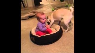 Perjuangan antara anjing dan bayi mengenai kepemilikan tempat tidur yang sah terlalu lucu untuk ditangani.