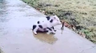 Finny si babi sedang mencoba berjalan di trotoar yang menanjak, tapi dia terpeleset di atas es dan menjadi lucu ke belakang lagi.