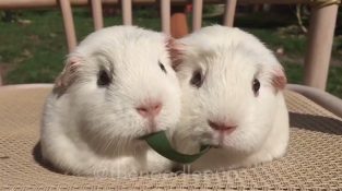 Dua kelinci percobaan memakan sepetak rumput, menciptakan kembali adegan spageti terkenal dari film animasi The Lady and the Tramp.