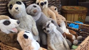 Seekor meerkat tertidur dengan tenang di sekeranjang boneka binatang.