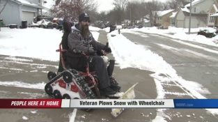 Seorang veteran setempat menggunakan kursi rodanya yang telah dimodifikasi untuk membantu orang lain membajak salju.