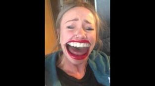 Seorang wanita tertawa saat syuting menggunakan aplikasi Face Swap Live.