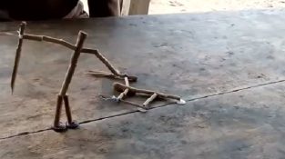 Dua anak kecil di Thailand membuat mainan pertarungan dari kayu dan tali. Setiap pemain memanipulasi bidaknya dengan menarik dua senar di bawah meja, kedua sosok itu berduel.