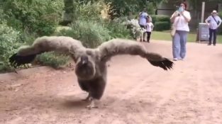 Seekor condor besar dengan penuh semangat mendekati seorang pria, untuk makan es krim.