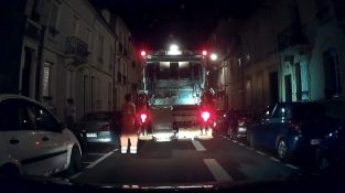 Sebuah truk sampah di Perancis secara tidak sengaja menghancurkan tempat sampah beserta sampahnya.