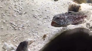 Dua ikan Opistognathus robinsi berkelahi di dalam gelas, dan yang satu melemparkan kotoran ke wajah yang lain.