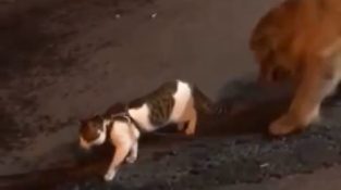 Seekor anjing Golden Retriever menarik kerah kucing, ketika dia melihatnya bergerak agresif terhadap yang lain.