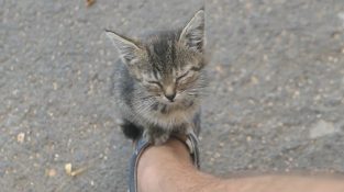 Anak kucing itu tinggal di jalanan dan tidur di sepatu kets saya.