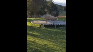 Seekor domba melompat di atas trampolin di Selandia Baru.