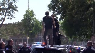Polisi Fresno hari Kamis menangkap seorang pria yang terlihat dalam video melompat ke atas kendaraan polisi, menyebabkan ribuan kerusakan.
