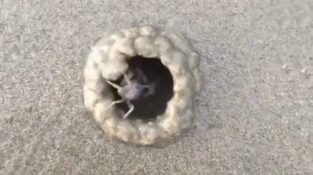 Seekor kepiting penggelembung pasir membuat igloo dari pasir di pantai.