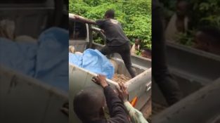 Saat sekelompok pria mencoba mendorong semi-truk ke atas bukit, salah satu dari mereka mendorong sambil berada di dalam gerobaknya.
