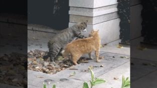 Seperti pegulat, seekor kucing melakukan headlock dan bergulat dengan kucing lain.