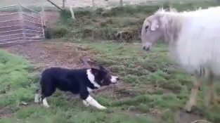 Anjing gembala memindahkan domba yang keras kepala ke kandangnya