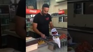 Seorang penjual falafel melayani pelanggannya di sebuah restoran di Afola, Israel. Mengisi kantong kertas dan menyiapkan sandwich dengan menyulap falafel.