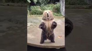 Di kebun binatang, seekor beruang memberi isyarat dengan cakarnya kepada seorang pria yang meminta untuk melemparkan makanan.